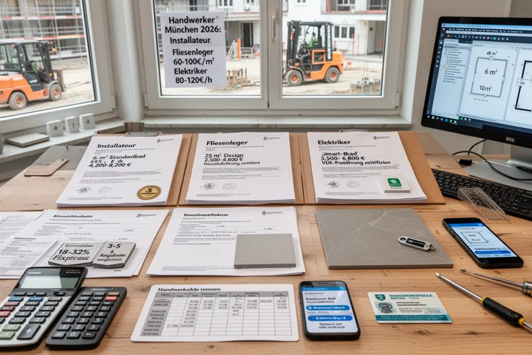 Handwerker München 2026 Stundenlöhne: Installateur 65–105 €/h, Fliesenleger 60–100 €/m², Elektriker 80–120 €/h. Fixpreisverträge 18–32% günstiger!